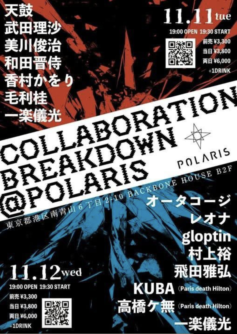 また対バンにはGIGANOISEでお馴染み一楽儀光はじめ関西の重鎮アーティス 山本精一と河端一、ANTIBODIES Collectiveのダンサー東野祥子まで!