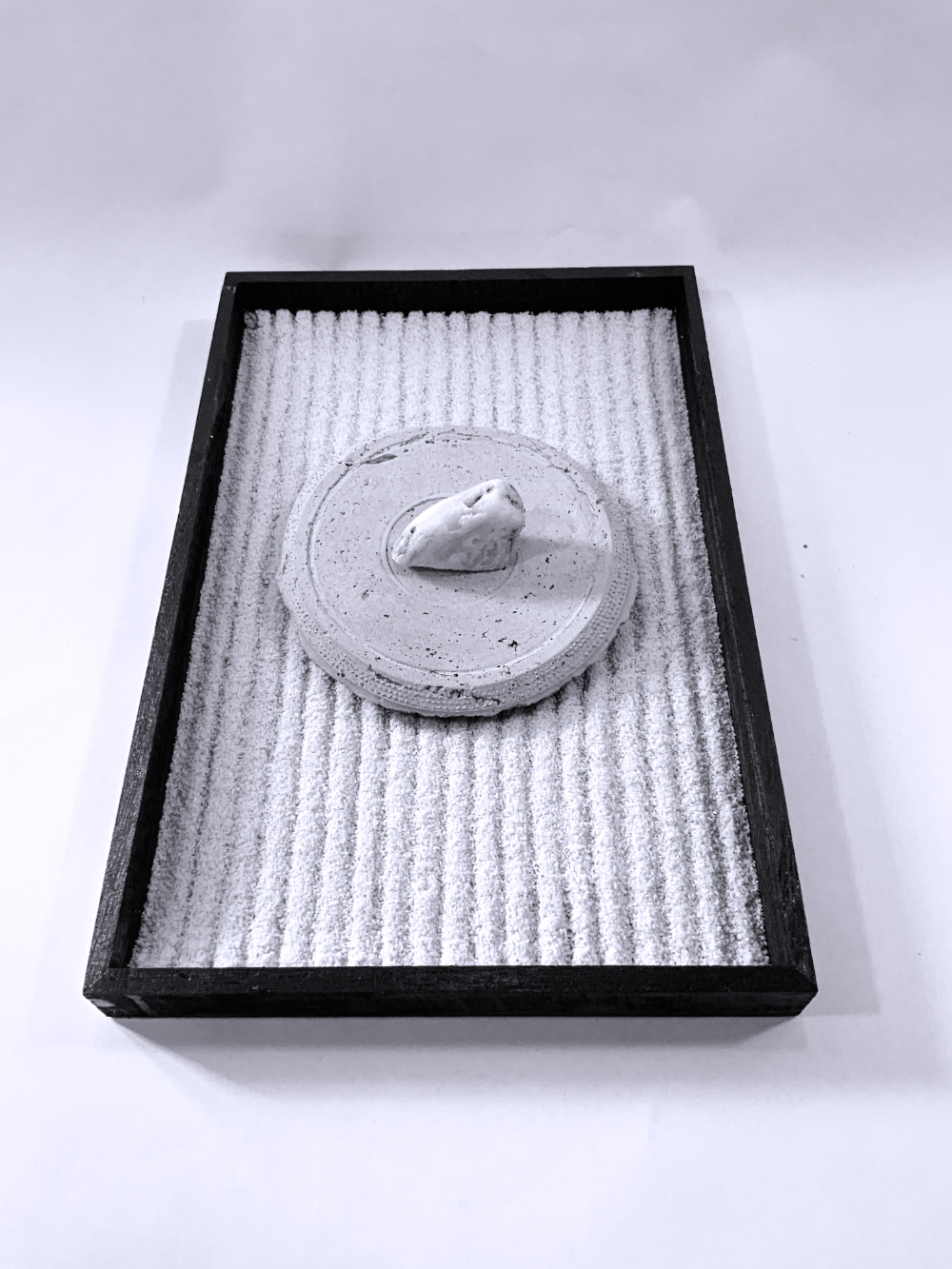 この作品は、砂と石とターンテーブルで無の境地を目指す禅の趣が影響を与えた飾り気のない閑静な庭園「枯山水」を表現しました。